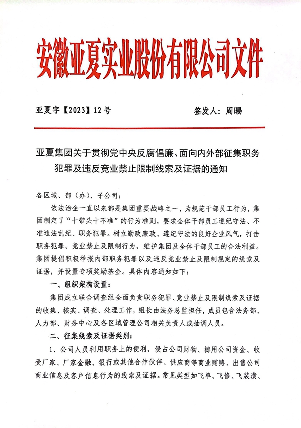 亞夏集團關于貫徹黨中央反腐倡廉、面向內外部征集職務犯罪及違反競業禁止限制線索及證據的通知